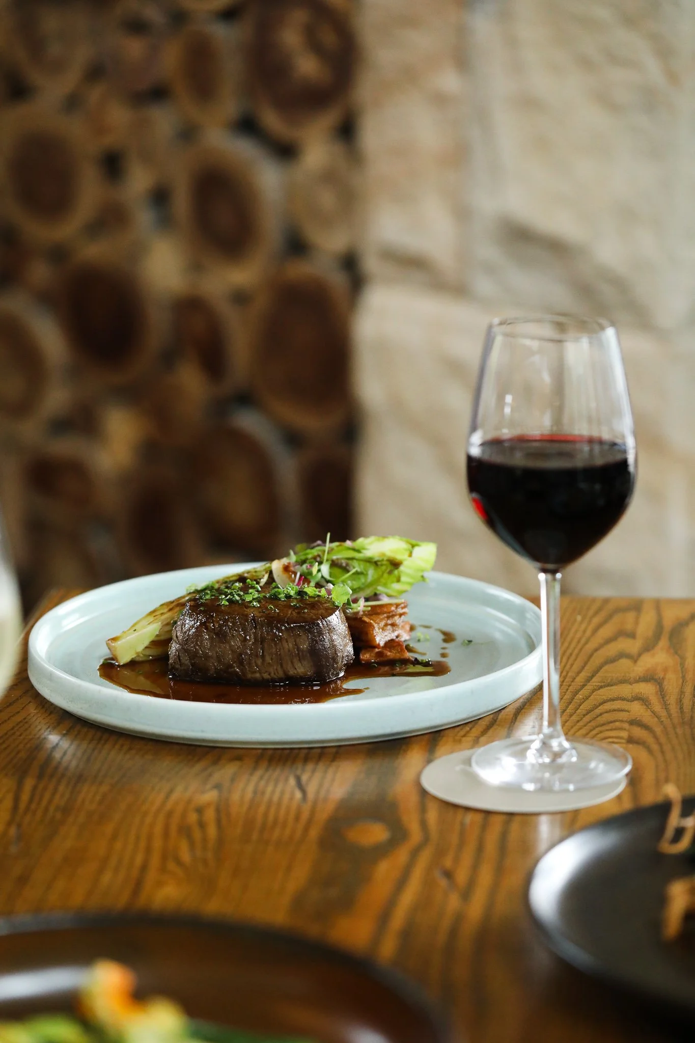 Pan Seared Eye Fillet (MB+2), beef fat potato cake, confit shallot, crunchy lettuce, red wine jus (GF, DF) 62